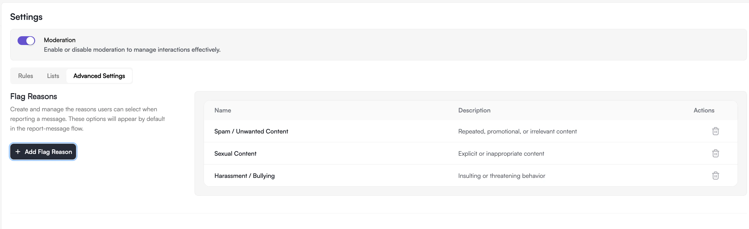 Configure flag reasons: Dashboard → Moderation → Advanced Settings