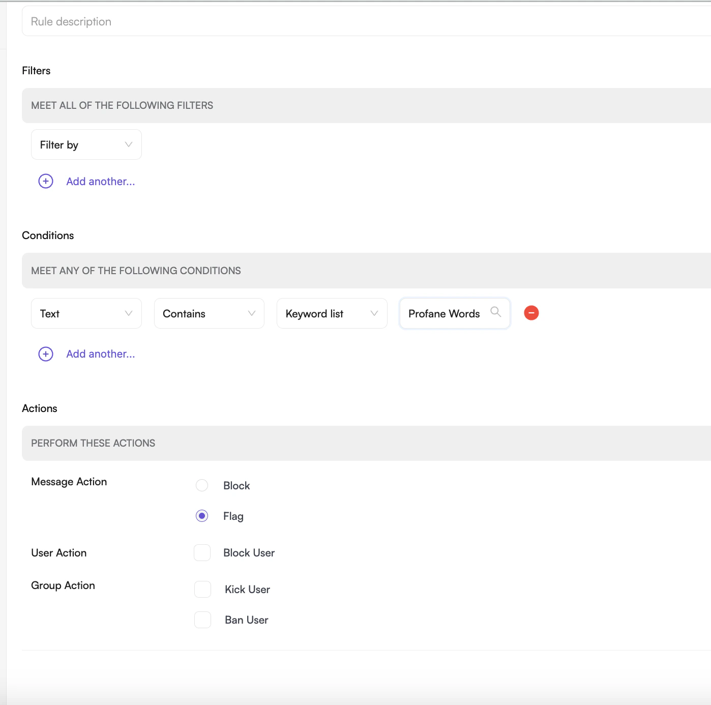 | 2. Flagging | Message is flagged either manually by users or automatically by the rule engine |