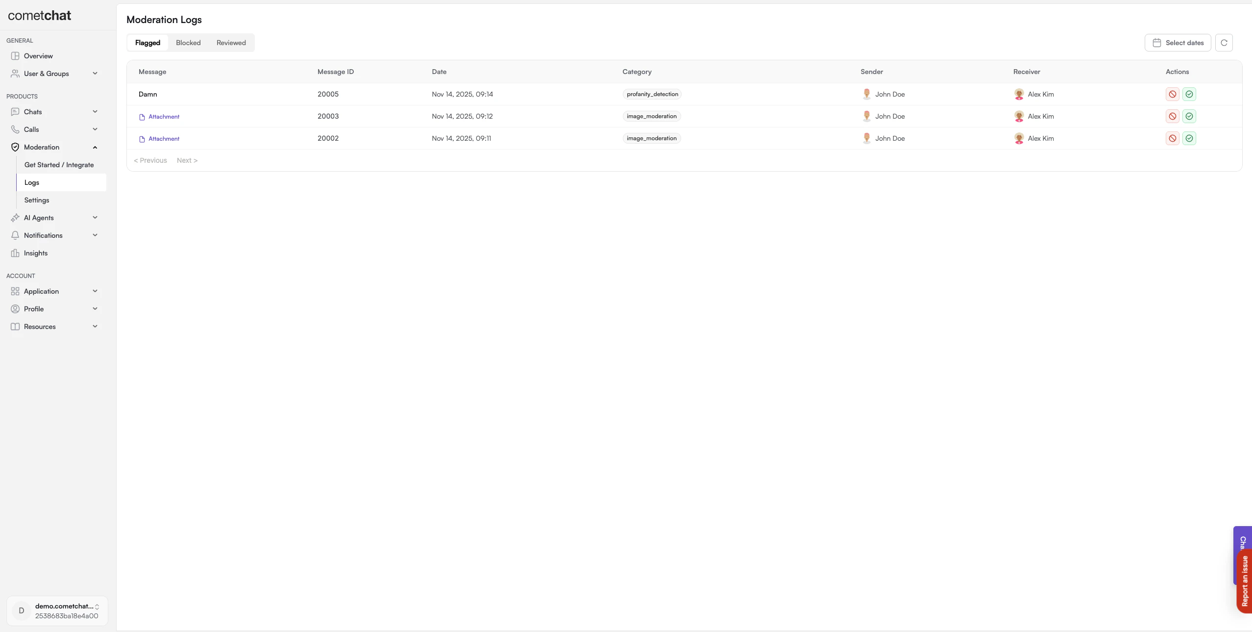 Login to CometChat Dashboard → Select your app → Moderation → Flagged Messages