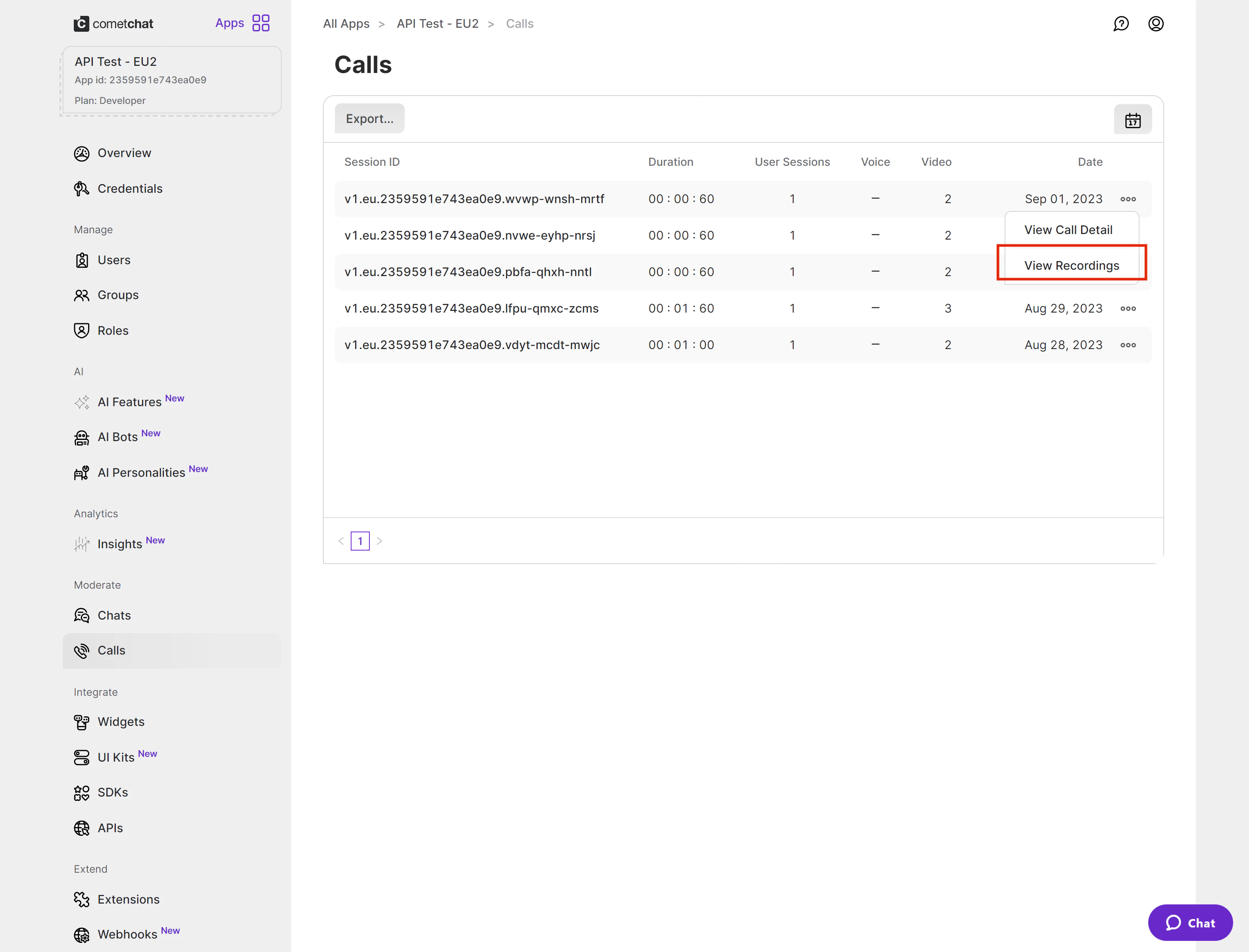 Currently, the call recordings are available on the CometChat Dashboard under the Calls Section. You can refer to the below screenshot.