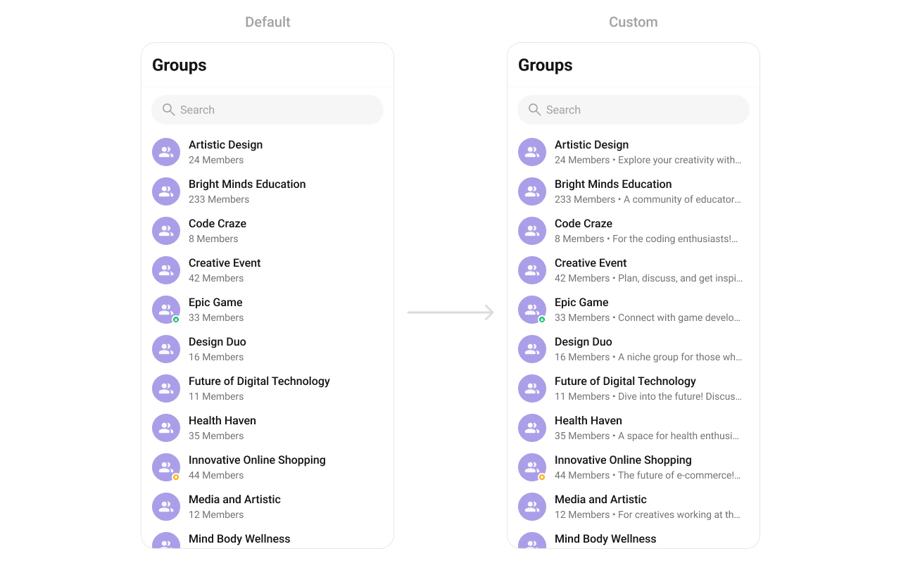 | Subtitle view | setSubtitleView(GroupsViewHolderListener) | Subtitle text below name |