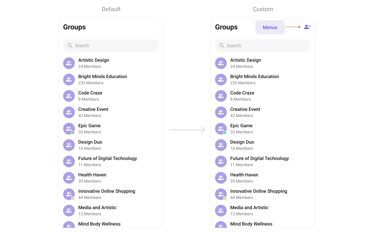 | Leading view | setLeadingView(GroupsViewHolderListener) | Avatar / left section |