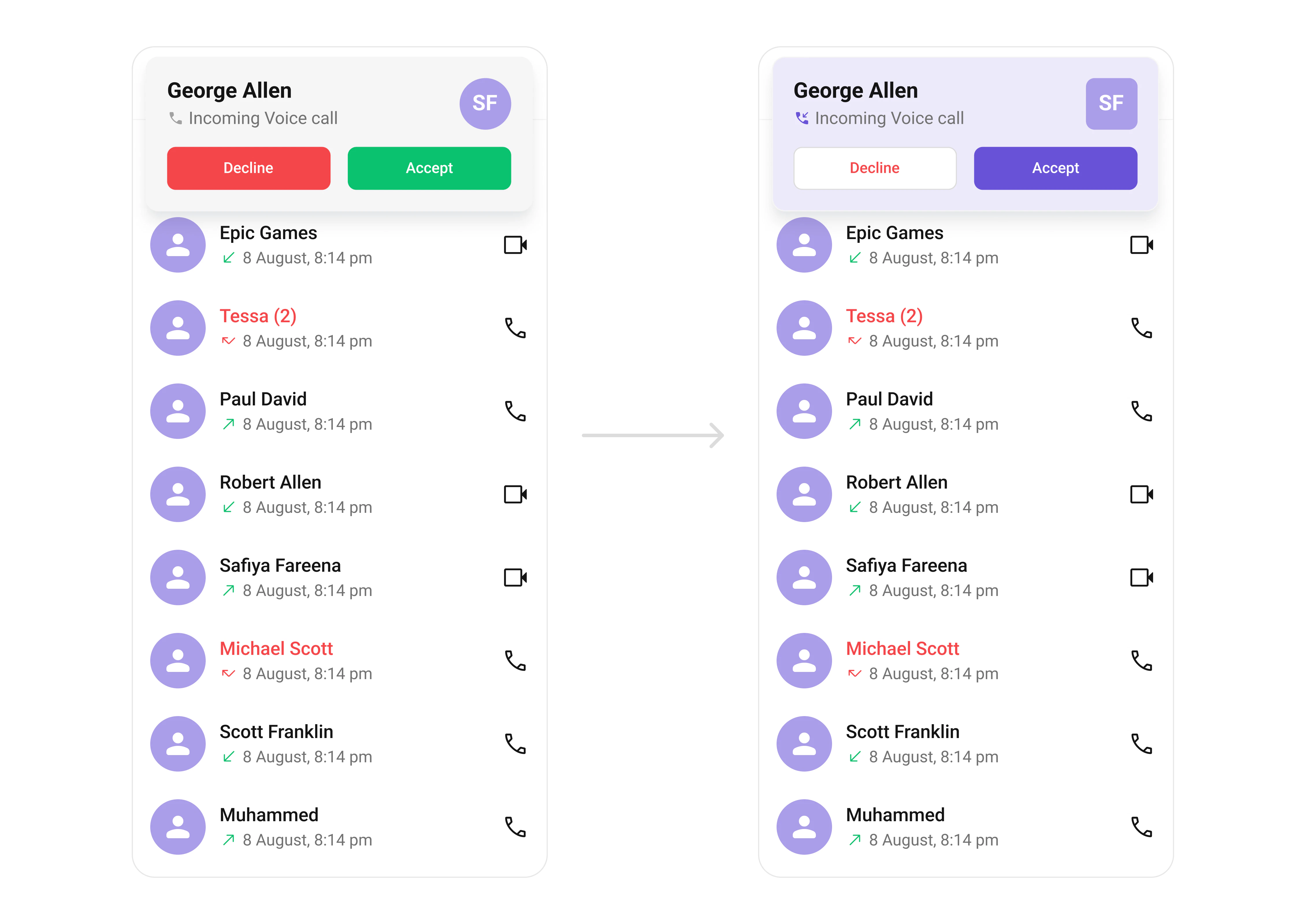 | Background color | themes.xml | CometChatIncomingCallStyle with cometchatIncomingCallBackgroundColor | <item name="cometchatIncomingCallBackgroundColor">#AA9EE8</item> |