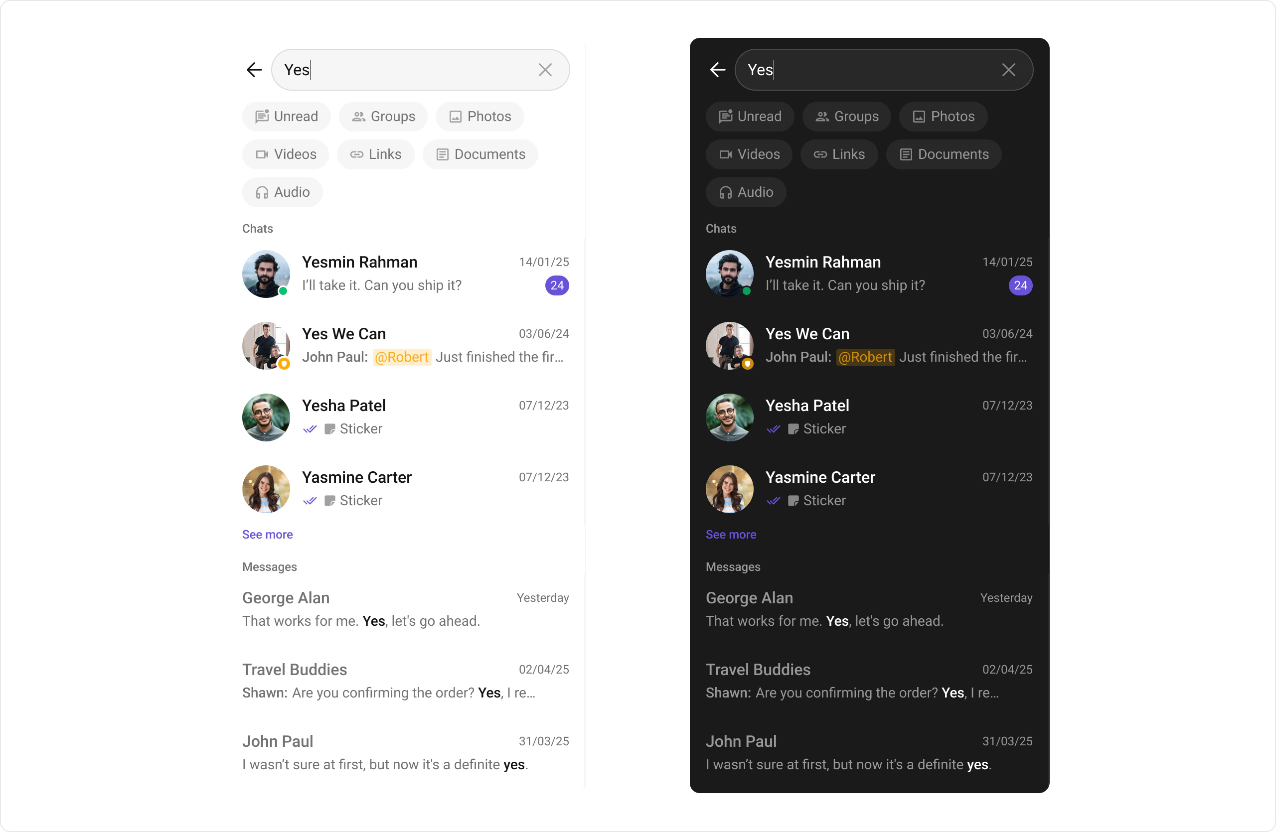 | Set initial active filter | Activity/Fragment | setInitialSearchFilter(SearchFilter) | .setInitialSearchFilter(UIKitConstants.SearchFilter.MESSAGES) |