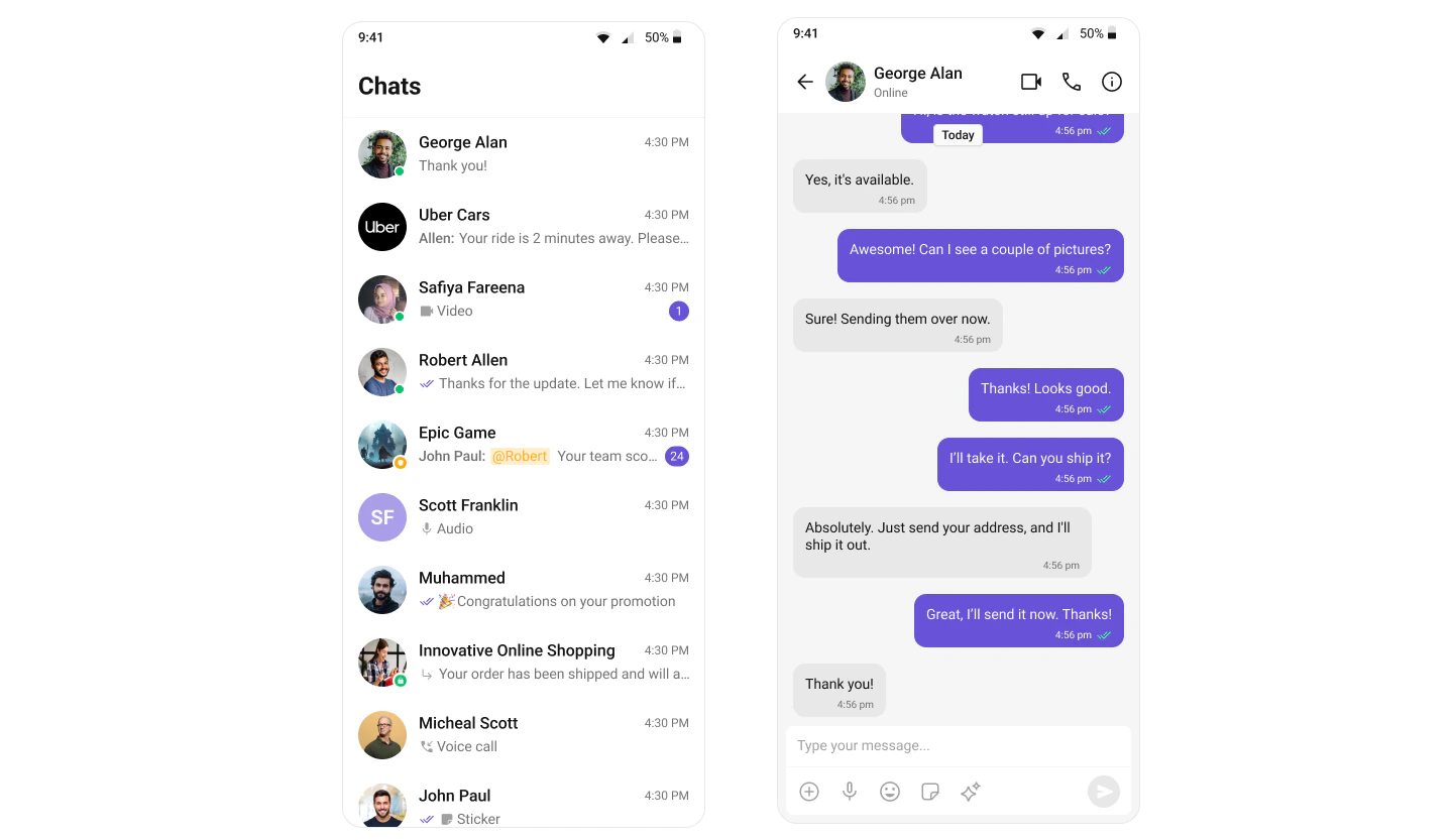 | Dark mode | Kotlin: values-night/themes.xml overrides. Compose: provide a different CometChatColorScheme based on isSystemInDarkTheme() |