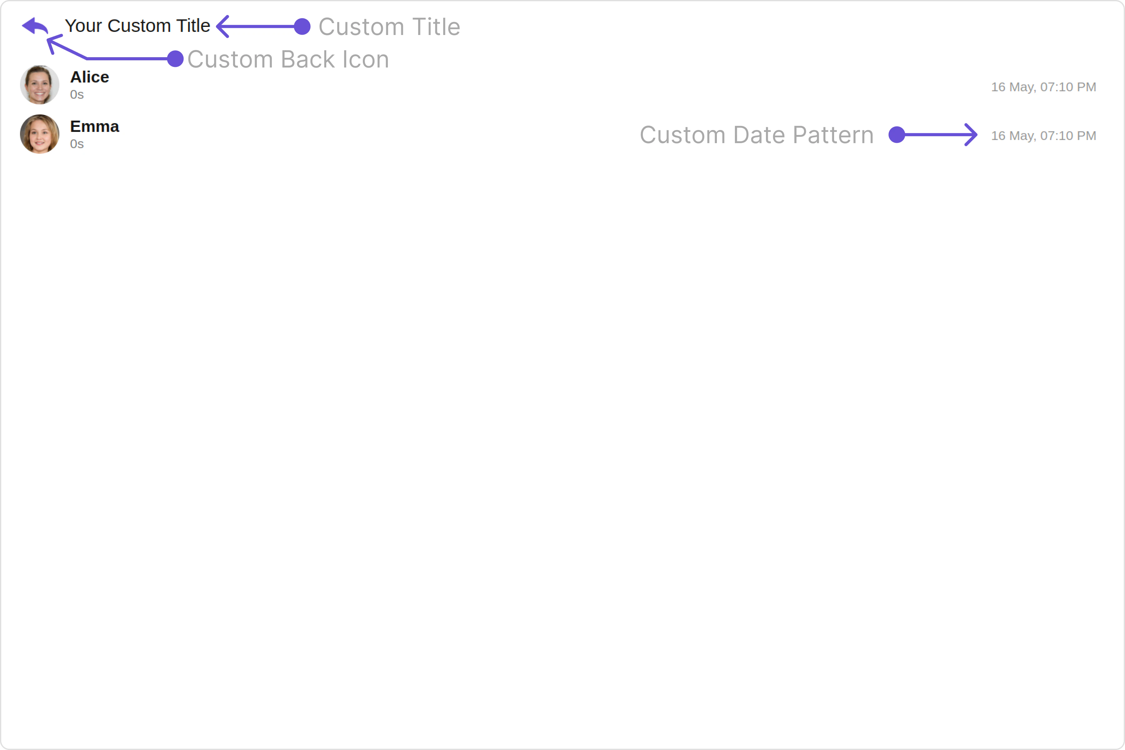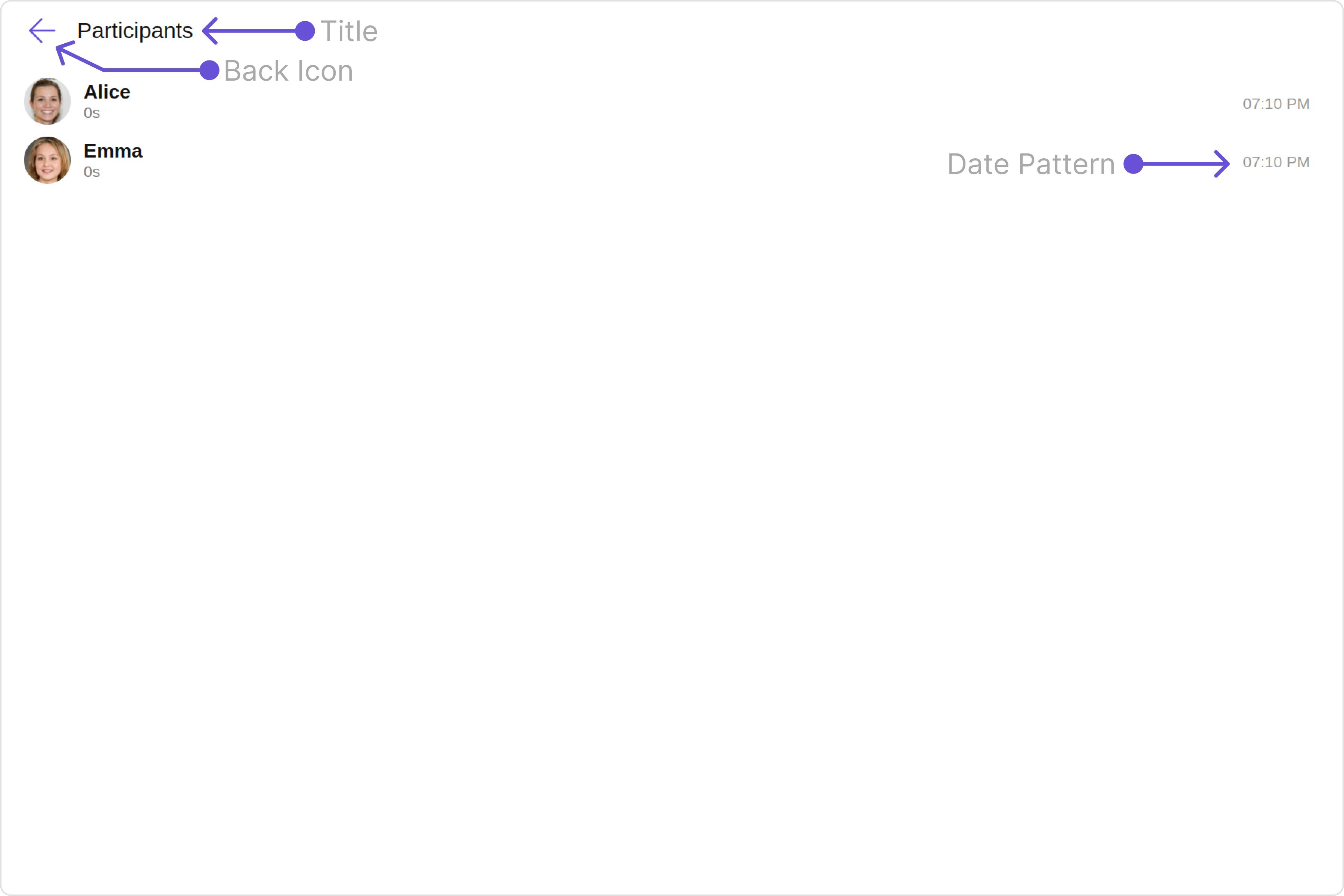 To fit your app’s design requirements, you have the ability to customize the appearance of the CallLogParticipants component. We provide exposed methods that allow you to modify the experience and behavior according to your specific needs.